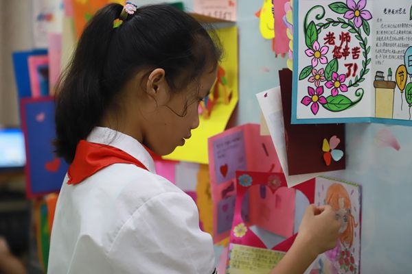下午3點,大隊委委員宣布活動開始,出隊旗,敬隊禮,活動在莊嚴肅穆的氛圍中拉開了序幕。首先是四(3)班中隊李卓軒、劉若妍為教師節獻詞,他們聲情并茂地朗誦了一首詩歌,感染了在場的師生們。接著是心意卡展示,各班代表手執自制精美的心意卡在臺前傾訴對老師的熱愛和祝福,然后將其掛在心意墻上。緊接著,校合唱隊演唱了一首世界名曲《可愛的家》,將校園比作大家庭,唱出了對老師的感恩和愛戴。歌聲悠揚動聽,贏得了同學們熱烈的掌聲。合唱結束后,全體教師上臺宣誓,重溫教師誓言,不忘初心、牢記使命,做“四有”好老師,做好學生引路人。宣誓完畢,孩子們為老師獻上鮮花,并表演手語歌《聽我說,謝謝你》,孩子們的眼里充滿深情,動作整齊劃一,童聲真摯悅耳,現場氣氛溫馨感人。最后,少先隊輔導員伍煜獻老師帶領隊員們呼號:“準備著:為共產主義事業而奮斗!”全體少先隊員齊聲回應: “ 時刻準備著!”活動在孩子們激昂的呼號聲中落下帷幕,取得了圓滿的成功。