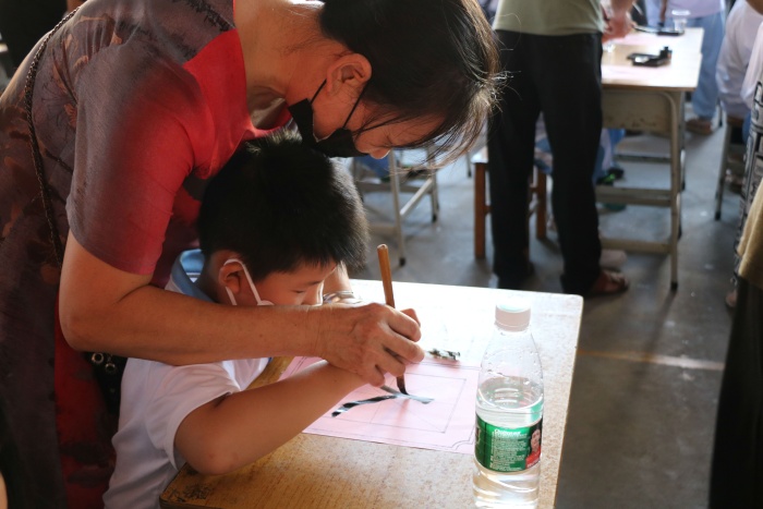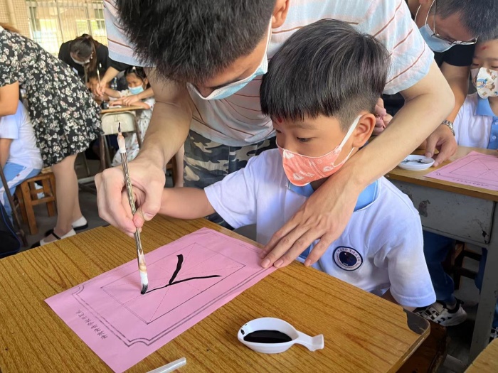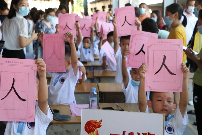 第五個環(huán)節(jié),到了描紅“人”字時,學校常務奚水清校長則上臺教同學們書寫“人”字,并大聲告訴同學們:“今天我們以一個‘人’字開筆,要把這個‘ 人’字也寫得堂堂正正、穩(wěn)穩(wěn)當當、神采飛揚、氣勢非凡。這是因為我們進學校學習首先要學會做人,做人首先就必須堂堂正正地立身”。