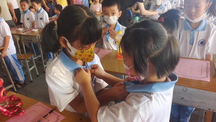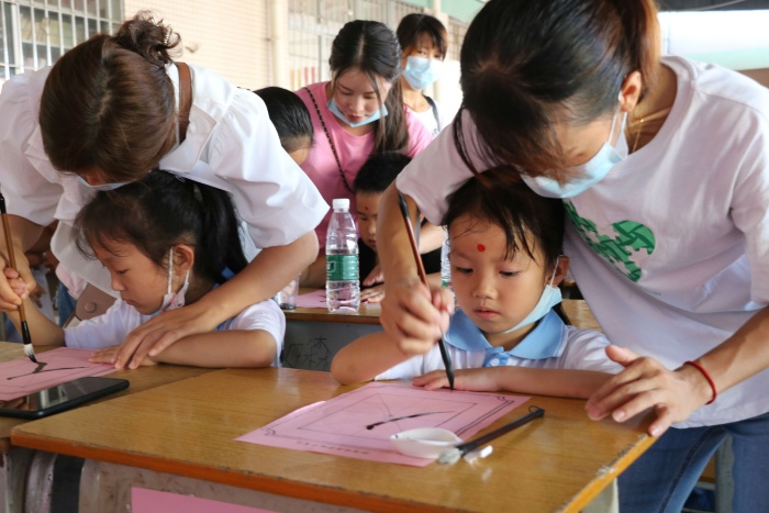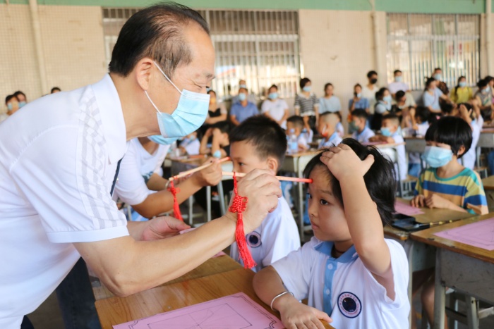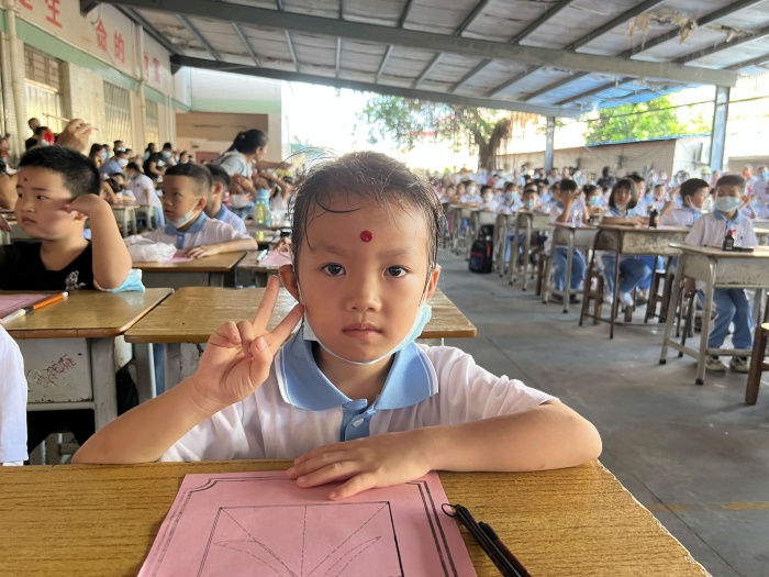 到了第三個環(huán)節(jié)則是“朱砂啟智”。在古代,學童入學讀書前,都會有啟蒙師長用紅色的朱砂在學子們的額頭正中點上紅痣,稱為“開天眼”。當中的“痣”通“智”,意為開啟智慧,以此寄托美好的愿望,從此眼明心亮,奮發(fā)學習。在這一活動里,孩子們也紛紛亮出自己的天眼,感謝老師的啟蒙。