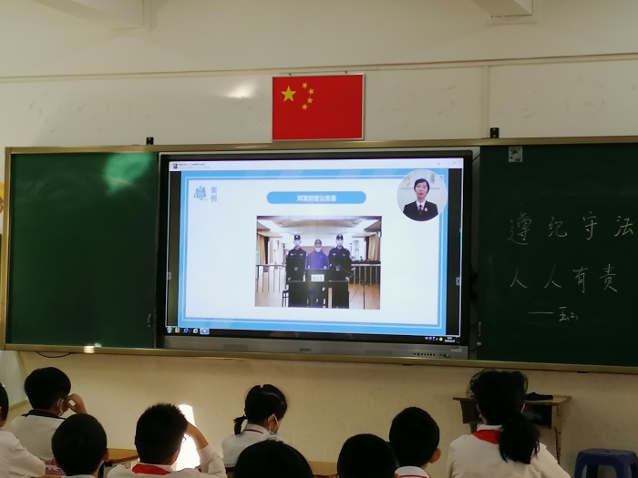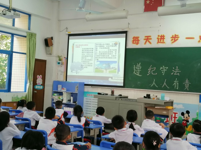 班會課中,梁小玲副校長以《民法典》為上課的主要內容,帶著學生認識了幾個重要的法律知識,如:我們中國的法律從什么時候開始的?為什么有法律的產生?國家法制宣傳日的時間是哪一天?我們在學校學習是如何受法律保護的?我們身邊的法律有哪些?等等。梁小玲副校長用生動的故事和學生身邊的真實事例進行深入淺出地講解,令枯燥乏味的內容變得簡單易懂、生動有趣。接著用視頻的形式,截取了中山市人民檢察院洪敏樺檢察官關于《依法抗“疫”人人有責》的講座,讓學生們認識到不執行疫情防控措施的法律后果。洪法官用了兩起疫情中發生的違法事件,具體講述了這一條法律的重要性和必須性,以及帶來的嚴重后果,讓大家認識到落實好《中華人民共和國防疫法》是非常必要的。在本次法制教育中,除了有班會課的學習,校園內還懸掛了橫幅,張貼了法律宣傳海報,從多途徑引導學生學法守法,做新時代好少年。