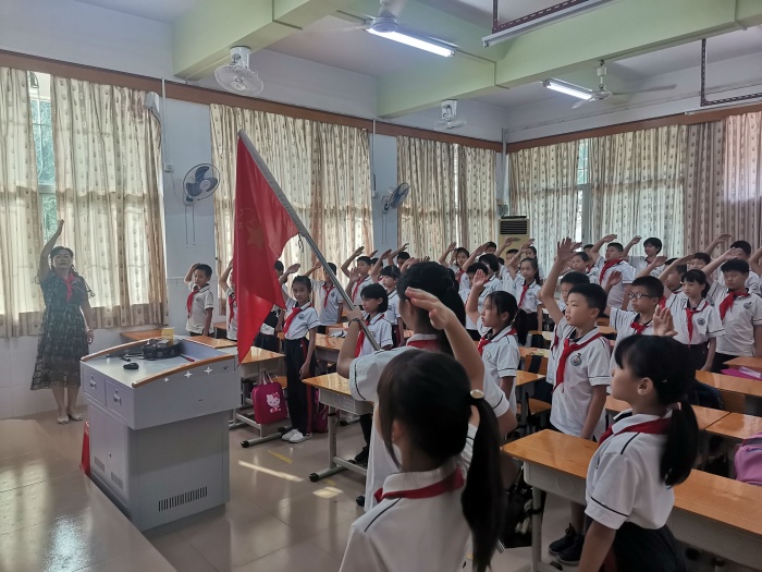 為迎接中山市第八次少代會召開營造良好社會氛圍,帶領全市少先隊輔導員和少先隊工作者,共同團結、教育、引領少先隊員高舉隊旗跟黨走,努力成長為能夠擔當民族復興大任的時代新人。9月18日,厚興鄭偉權學校少先隊大隊舉行喜迎“八少”提心愿 高舉隊旗跟黨走主題中隊會活動。