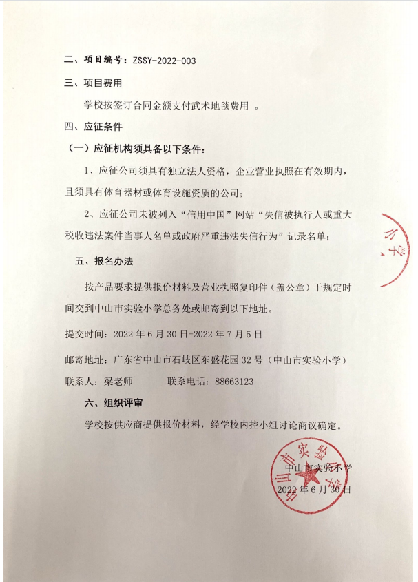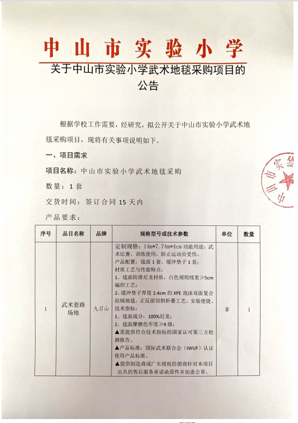 關于中山實驗小學武術地毯采購項目的公告