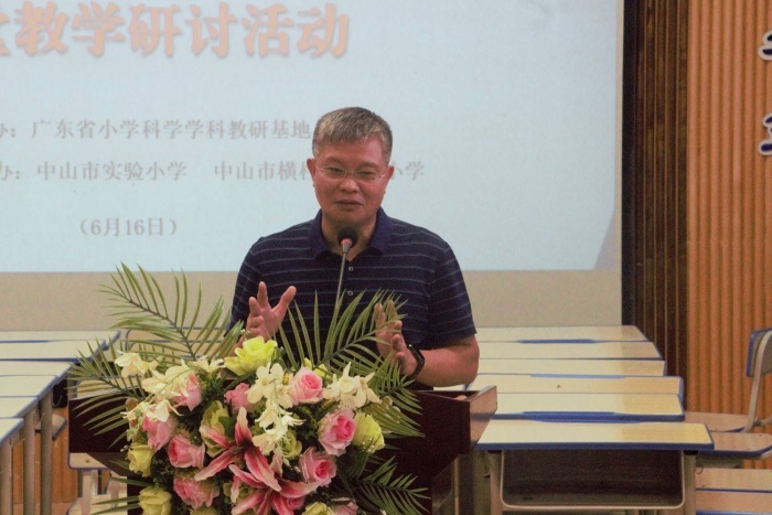 最后,廣東省小學科學教研基地(中山)主持人、中山市教育教學研究室教研員馮玉生老師對此次專題研討進行點評。他充分肯定在本次研討活動中彰顯了承辦單位強大的教研力量和資源支撐,以及強大執行力,為全市科學教研搭建了良好的平臺。他認為兩位老師能以新課程標準來開展課堂教學,以核心素養為導向促進深層次學習,讓學生親身經歷項目設計-制作-測試-評價-改進的過程,并依托平板智慧課堂設備開展課堂評價、促進了學生科學素養和動手實踐能力的提升。