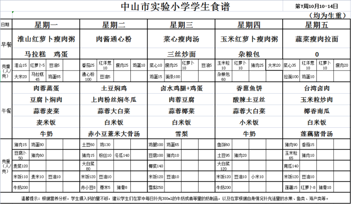中山市實驗小學第7周學生食譜