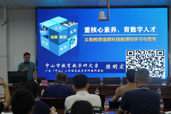 教育部“國培計劃”專家庫成員、廣東省特級教師、中山市教育教學研究室信息技術教研員、廣東省小學信息技術(中山)教研基地負責人陳明宏老師以頭腦風暴的形式開展《重核心素養·育數字人才——義務教育信息科技新課標學習與思考》專題講座,他圍繞“課標核心要點、課程內容體系、教學實施建議、中山實踐思考”這四個方面深度解讀,并結合鮮活的案例進行分析,引導大家對新課標的學習與應用展開思考。