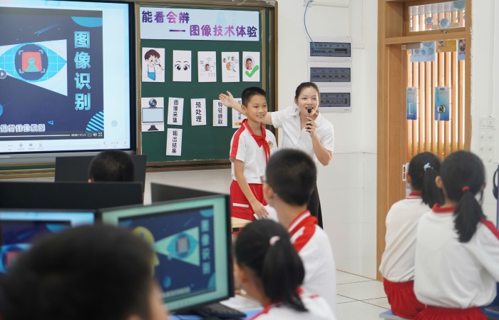 中山市火炬開發區博凱小學黃美瓊老師執教人工智能課例《能看會辨——圖像技術體驗》。黃老師通過日常生活中的“美圖秀秀”拍照創設問題情境,引出本課主題,把教學問題情境化、把教學情境生活化、把教學任務活動化,滲透信息科技核心素養。學生通過自主體驗、小組合作、交流探究等方式,了解圖像識別的過程,知道圖像識別技術在生活中的廣泛應用,能用辯證的眼光看待人工智能技術的發展。課堂高效互動,學生興趣盎然。