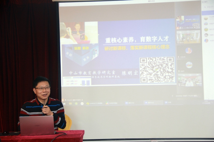 本次聯(lián)合研修的第二議程是專家講座。廣東省小學(xué)信息技術(shù)(中山)教研基地負(fù)責(zé)人、中山市教育教學(xué)研究室信息技術(shù)教研員陳明宏老師作《融科技素養(yǎng) 育數(shù)字人才》主題講座,陳老師從跨學(xué)科主題教學(xué)的內(nèi)涵、路徑和策略三大方面進(jìn)行分享。首先,跨學(xué)科主題學(xué)習(xí)的提出與基礎(chǔ)教育課程改革與教學(xué)信息化發(fā)展歷程有著密切的聯(lián)系,當(dāng)前跨學(xué)科主題學(xué)習(xí)強(qiáng)調(diào)的是跨,聚焦在主題。其次,陳老師指出跨學(xué)科教學(xué)的實(shí)踐路徑主要有“找、定、分、合”,即找到融合點(diǎn)、確定融合主題、劃分若干子目標(biāo)合交叉相似點(diǎn),并且結(jié)合若干個(gè)具體的課例進(jìn)行分享當(dāng)前中山團(tuán)隊(duì)在跨學(xué)科教學(xué)中的探索成果。最后,跨學(xué)科教學(xué)要基于真實(shí)性的學(xué)習(xí)和基于項(xiàng)目式的開展,而學(xué)科知識是跨學(xué)科開展的載體,學(xué)科活動是跨學(xué)科教學(xué)的途徑,跨學(xué)科主題教學(xué)不僅是新挑戰(zhàn),更是專業(yè)發(fā)展的新機(jī)遇。