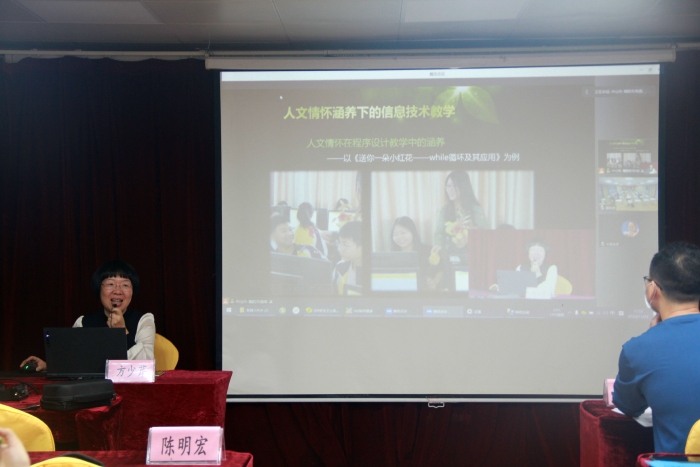 廣東省初中信息技術(shù)(揭陽)教研基地負(fù)責(zé)人、揭陽市初中信息技術(shù)教研員方少芹老師以《人文情懷涵養(yǎng)下的信息科技教學(xué)》為主題開展專題講座,方老師從引言:新課標(biāo)下一座城市的教學(xué)夢想;方向:新課標(biāo)中人工智能教學(xué)的關(guān)鍵詞;模式:做好人工智能教學(xué)的秘笈三大方向進(jìn)行展開,方老師表示新課標(biāo)對所有的老師都是新機(jī)遇、新挑戰(zhàn)。同時(shí),方老師以自身的教學(xué)經(jīng)歷結(jié)合新課標(biāo)提出人文情懷的涵養(yǎng)教學(xué)思想,倡導(dǎo)大家在傳統(tǒng)文化中、在貼近學(xué)生生活中、在藝術(shù)中尋找人文,并與技術(shù)進(jìn)行融合教學(xué),使信息科技課堂教學(xué)涵養(yǎng)人文情懷的氣息,在潤物細(xì)無聲中發(fā)揮課程育人的價(jià)值。方老師充滿溫度的教育理念——求真、臻美、向善,激蕩著大家的心靈。