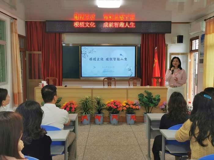 中山市實(shí)驗(yàn)小學(xué)鄭亞文主任作了主題為《根植文化 成就智趣人生》學(xué)校傳統(tǒng)文化教育工作分享。鄭主任分別從四個(gè)方面介紹了我校在中華優(yōu)秀傳統(tǒng)文化教育方面的工作經(jīng)驗(yàn)。一是凸顯經(jīng)典,建設(shè)校園文化。我校文化環(huán)境建設(shè)體現(xiàn)了系統(tǒng)化、自然化、功能化的特點(diǎn)。二是科研引領(lǐng),實(shí)現(xiàn)課程育人。主要介紹了學(xué)校語(yǔ)文學(xué)科4個(gè)傳統(tǒng)文化立項(xiàng)課題,這些課題研究方向明確,措施有力,研究成果豐厚。三是多元實(shí)踐,實(shí)現(xiàn)文化育人。我校堅(jiān)持開(kāi)展了傳統(tǒng)文化教育主題系列活動(dòng)。如班會(huì)課、大課間、研學(xué)活動(dòng)、學(xué)校的校園文化“四節(jié)”系列活動(dòng);學(xué)科教師將傳統(tǒng)文化教育與各自的教育教學(xué)相融合,還將優(yōu)秀的課例帶到了海外,收獲了好評(píng)。四是且行且思,拓新傳承視野。講座還提出了一系列值得探討的問(wèn)題。與會(huì)的老師們受益良多,深切感受到:中華優(yōu)秀傳統(tǒng)文化是中華民族的精神命脈,是涵養(yǎng)社會(huì)主義核心價(jià)值觀的重要源泉。今后將繼續(xù)有效多樣地開(kāi)展中華傳統(tǒng)文化教育,讓學(xué)生傳承和發(fā)揚(yáng)中華優(yōu)秀傳統(tǒng)文化!