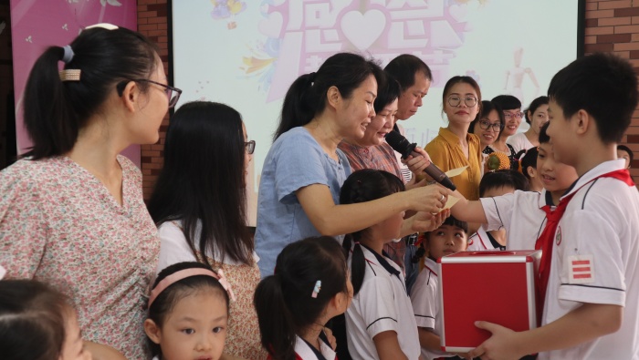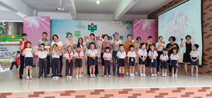 慶祝活動還穿插別具匠心的抽獎環節:以年級組為單位。同學們的小手拉著老師們的大手走向舞臺,進行有趣的抽獎游戲。奇思妙想——奇異果;光芒四射——大芒果;秋水盈盈——秋水梨;紅紅火火——火龍果……老師們拿著獨特的獎品,驚喜之情溢于言表。