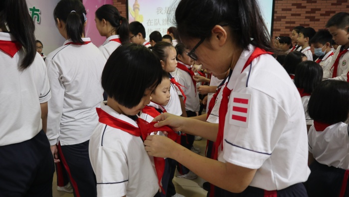 接著是新隊員入隊儀式。六年級的哥哥姐姐們給新隊員授予少先隊標志,幫助新隊員戴上鮮艷的紅領巾。大隊輔導員余鳳華老師帶領新隊員宣誓。每個新隊員都莊嚴宣誓,眼中熠熠發光,滿懷對少年先鋒隊的向往與期待。
