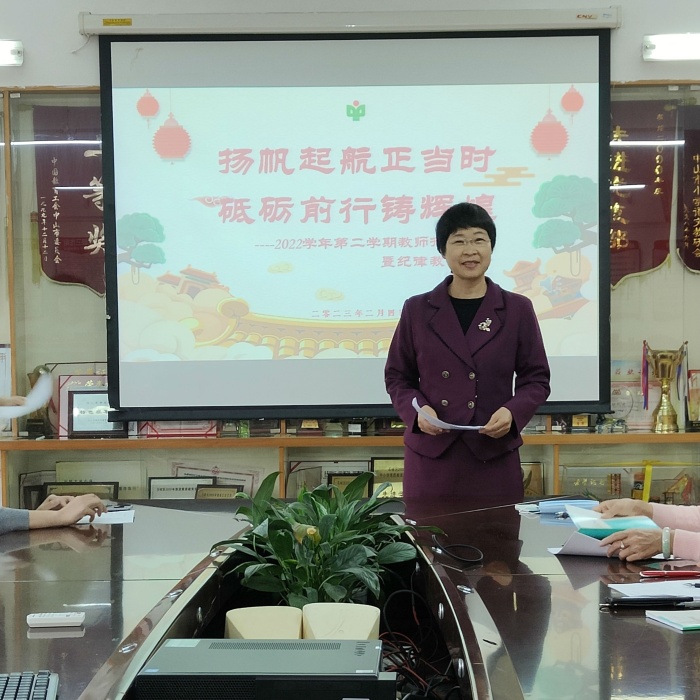會議在劉曉君校長的祝福聲中拉開帷幕!劉校長以“揚帆啟航正當時 砥礪前行鑄輝煌”為主題,總結了上學期的各項工作,回顧了上一學期,在市教育體育局和石岐街道黨工委的關心下,在學校領導的不懈努力下,該校一體機覆蓋了全校15個班級,并且每個課室都安裝了新空調。改善了辦學條件,優化了育人環境。這使學校的教學硬件設施建設實現了一次飛躍。同時,她總結了一學期以來學校取得的成績,對老師們凝心聚力搞教育、師生積極參加各項比賽并獲得優異成績、老師們積極參加教研及課題研究表示充分的肯定。