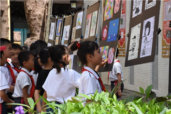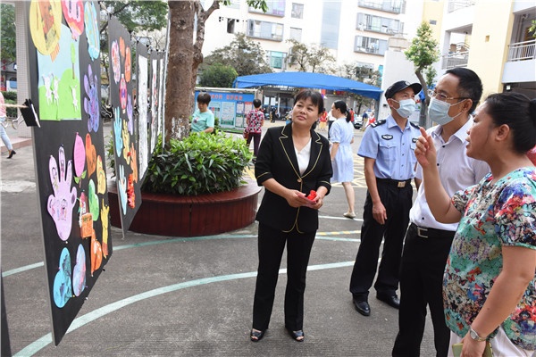 美術展欣逢迎六一,石岐街道黨工委委員李家新、民族社區謝明德書記、法制副校長黃錦華警官、關工委代表、家長代表等也來到該校為孩子們送上祝福,對孩子們的作品稱贊連連,同時也對學校的藝術教育工作給予了積極肯定。