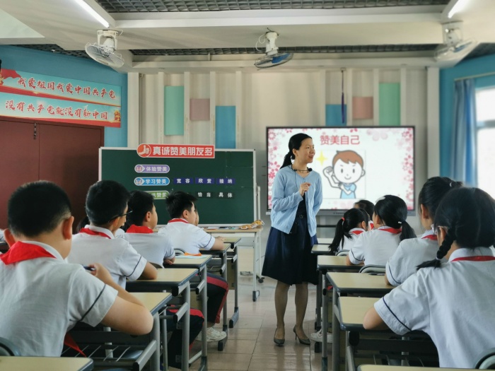 黃秋瑜老師以“心理小劇場”導入,激發學生興趣,讓學生在游戲中引起共鳴。黃老師設計了四個教學環節:一是“體驗贊美”;二是“學習贊美”;三是“表達贊美”;四是“傳播贊美”,環環相扣,層層遞進,深入淺出地引導學生體驗被贊美和贊美別人的愉悅心情,學會用欣賞、接納品質與人交往,用真誠、恰當的語言表達贊美,最后將贊美運用到日常生活中,讓贊美成為一種習慣。在整個教學過程中,黃老師教態親切,相機引導,點評及時,學生受益良多。這節課也得到了以市教研員梁劍玲老師為首的聽課老師們的一致好評。