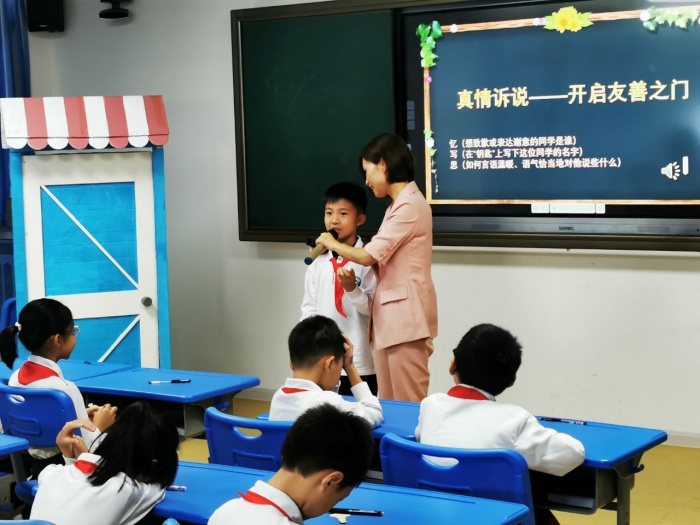 李榮老師首先以學生喜聞樂見的手偶表演創設情境,引出主題,讓學生了解什么是”友善表達”;接著組織學生通過觀看實驗視頻,討論總結,感受友善表達的重要性;然后通過游戲互動、辨析討論等環節,習得友善表達的方法:即“言語溫暖、語氣恰當”;最后通過情景闖關環節(第一關:看漫畫,練友善表達,第二關:聽情景,思友善表達,第三關:看視頻,論友善表達,第四關:去實踐,行友善表達),使學生在充滿著童真童趣的活動中學會運用友善表達的方法。李榮老師的主題班會課教學設計思路清晰,流程合理,巧設“懸念”,步步深入,誘導思辨;緊扣學生成長規律的特點, 通過學生喜聞樂見的教學素材,亦莊亦諧,吸引學生,給學生帶來積極的體驗。整節班會課富有活動性、特色性和創意性,受到了石岐街道教育和體育事務中心德育專干黃榮敏以及全體聽課老師的一致好評。