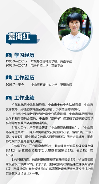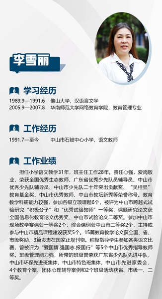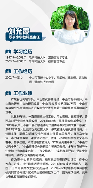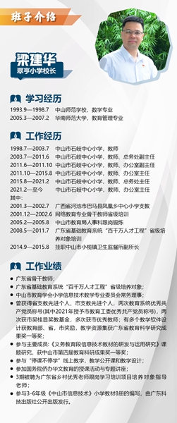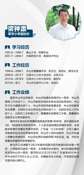 懷著敬仰,本著“承偉人志,揚理想帆”的辦學理念,中山市直屬學校——中山市石岐中心小學教育集團全力托舉翠亨小學,用心用情做好集團化辦學工作,第一年派駐了一支8名的骨干團隊。其中,1位校長,3位行政人員是長期派駐的,4位教師是按照市教體局相關文件精神輪崗的骨干教師。讓我們一起看看他們“閃光”的履歷: