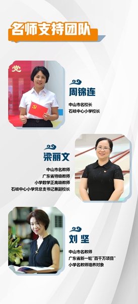 1.中山市石岐中心小學的名師團隊常駐翠亨小學,他們有中山市名教師、廣東省特級教師、正高級教師、學校的黨總支書記梁麗文,中山市名校長、學校校長周錦連,中山市名教師劉堅老師。作為集團化辦學的支撐團隊,做好頂層規劃、定期組織教研活動,開展教師培訓,全方位提升翠亨小學教育管理及教師隊伍的教研和教學能力。