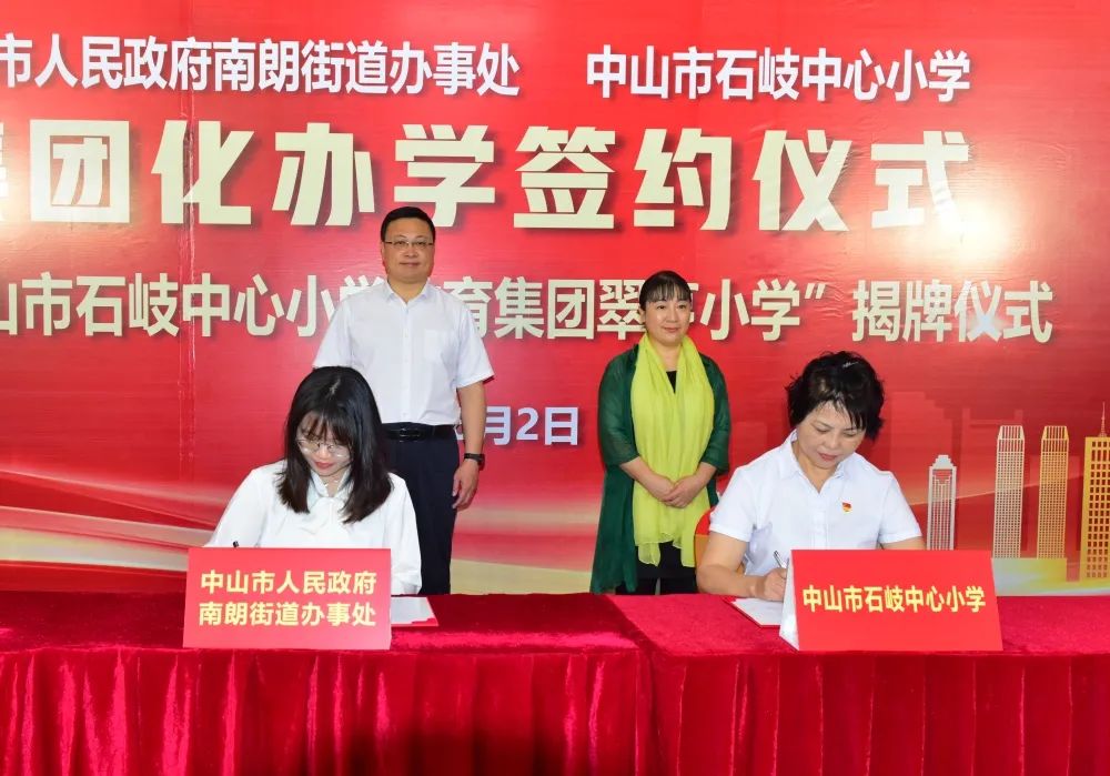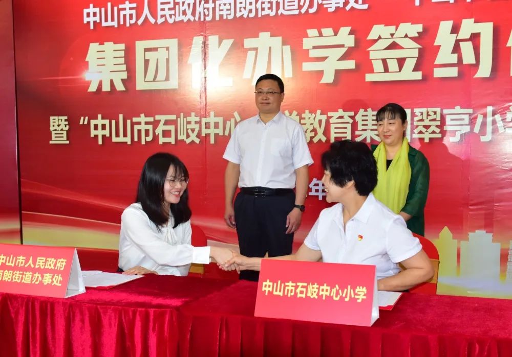 首先,在南朗街道黨工委副書記、辦事處主任許行,中山市教體局副局長王志紅兩位領(lǐng)導的見證下,中山市石岐中心小學校長周錦連與南朗街道辦事處副主任吳慧祺簽署了集團化辦學協(xié)議。