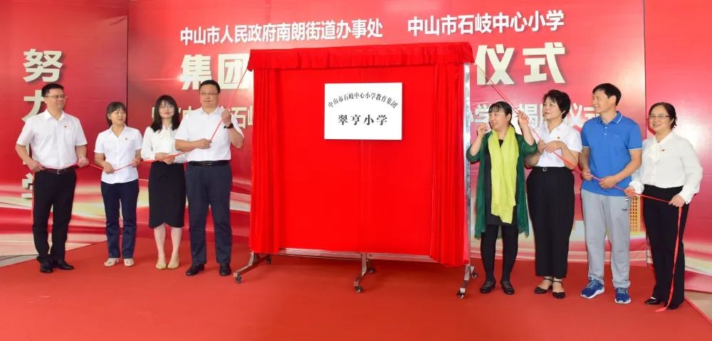 與會領(lǐng)導、嘉賓共同為“中山市石岐中心小學教育集團翠亨小學”揭牌,接著合照留念。