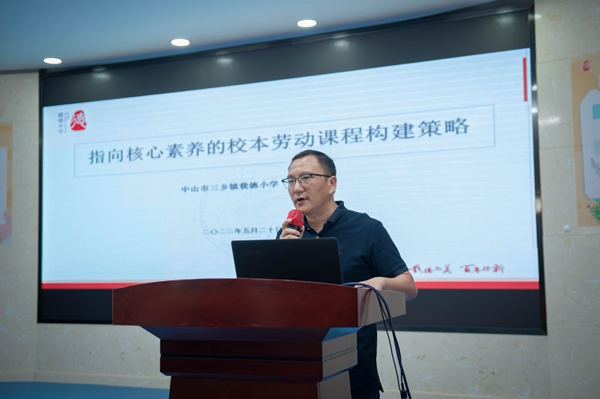 中山市三鄉鎮載德小學毛義祥校長作了題為《指向核心素養的校本勞動課程構建策略》的專題報告。毛校長從“協同、融合、開發、滲透”四個層面分享了載德小學的校本勞動課程構建:以學校為主導、家庭為基礎、社區為依托,家、校、社協同修養的勞動觀念;從校本勞動課程與德育、智育、體育、美育等學科間融合涵養勞動精神;以項目式學習為依托,從項目目標、內容、場地、技能開發勞動能力;從文化布置、主題教育、勞動實踐中滲透潤養勞動品質。