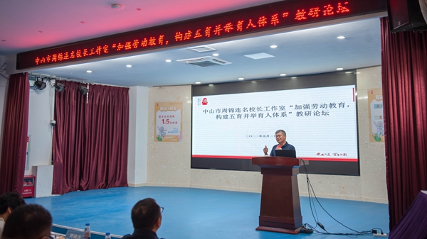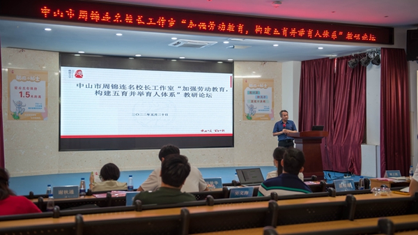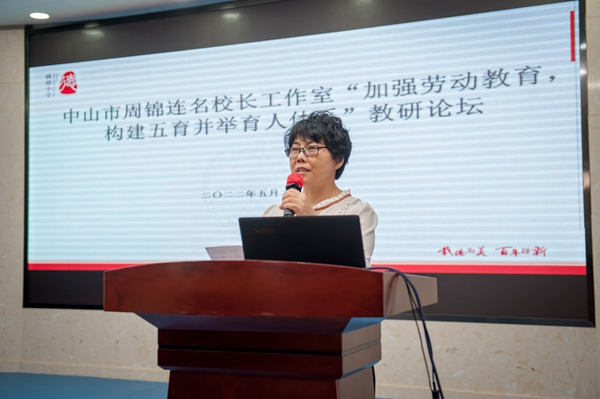 隨后,全體成員來到階梯室開展論壇研討活動,由中山市名校長工作室主持人周錦連校長主持。周校長簡單地介紹了《中共中央國務院關于全面加強新時代大中小學勞動教育的意見》《義務教育勞動課程標準(2022年版)》等文件,指出當今勞動教育的重要意義,并呼吁工作室成員們相互交流、學習和借鑒優秀經驗,共同促進學校勞動教育的發展。隨后,工作室的四位校長分別作了專題報告。