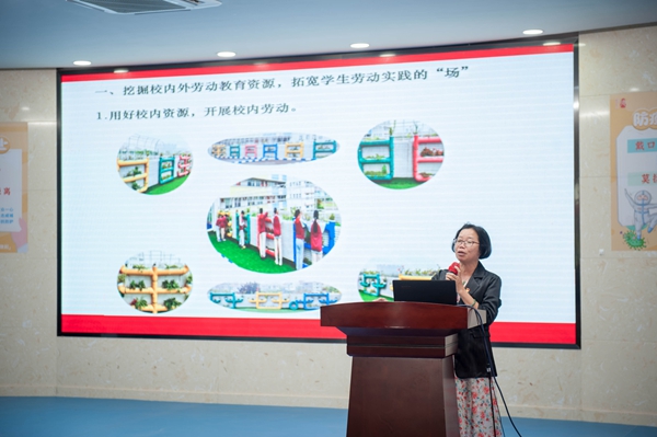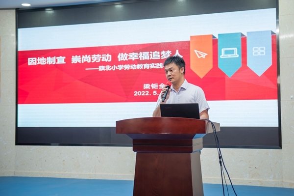 中山市大涌鎮旗南小學梁鉅全校長則作了《因地制宜,崇尚勞動,做幸福追夢人》的專題報告。他從學校傳承學生良好習慣,體驗勞動;掌握種植技能,學會勞動;豐富勞動陣地,熱愛勞動;全面宣傳展示,享受勞動等方面分享了學校在勞動教育的做法和經驗。此外,他還提出了要進一步加強勞動教育與德、智、體、美各育有機的整合,進一步研發校本勞動教材等后續發展方向。