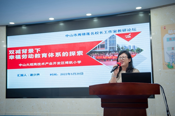 中山市火炬高技術產業開發區博凱小學謝少聲校長以《雙減背景下幸福勞動教育體系的探索》為題作了專題報告。謝校長結合博凱小學“以豐富多彩的幸福童年為本”的辦學理念:以問題為導向,確定教育目標;圍繞育人目標,設置實踐課程;結合學生特點,明確階段任務;把握勞動契機,豐富勞動實踐;探索教育內容,實現價值引領等方面進行了分享。