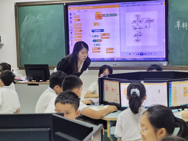 黃煒虹老師、周泳霏老師則針對五年級創意編程進行課程打磨。黃煒虹老師執教《小麥來玩球》一課,在完成基礎學習任務的同時,注重培養學生的創新意識,通過小組討論、匯報等形式,鼓勵學生拓展思維、表達想法,提升游戲趣味性。周泳霏老師執教《小麥猜猜樂》一課,引導學生分析游戲流程,將問題層層分解、化簡,最終解決問題,引導學生對程序進行迭代與優化,培養學生的計算思維能力。