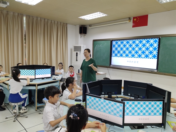 胡莉華老師、張敏滋老師、劉文東老師針對四年級趣味編程進行課程打磨。胡莉華老師執教《神奇的畫筆》一課,先引導學生思考并討論計算機編程軟件畫圖的優勢,不僅激發了學生學習興趣,更為培養學生數字化學習與創新能力打下基礎。胡老師注重學生探索創新能力的培養,鼓勵學生舉一反三,進行民族服飾的花紋設計,并通過編程實現。張敏滋老師執教《小麥捕魚》一課,通過引導學生實現魚兒水中游-小麥跟隨鼠標移動-繪制籃子-開始捕魚等幾個環節完成作品,鼓勵學生進行創新任務的完成。劉文東老師《小麥彈球》一課,通過引導學生發現問題、解決問題,幫助學生突破本節課的重難點,更在評價環節實現了生生互評與學生自評等多元化評價方式。