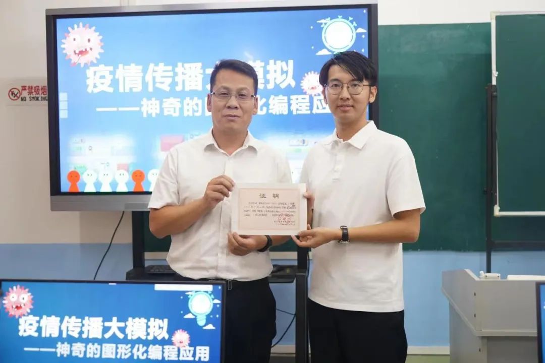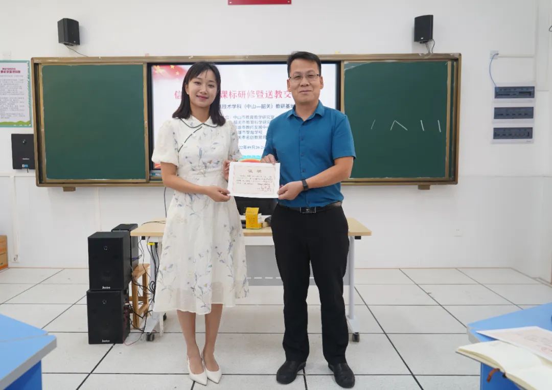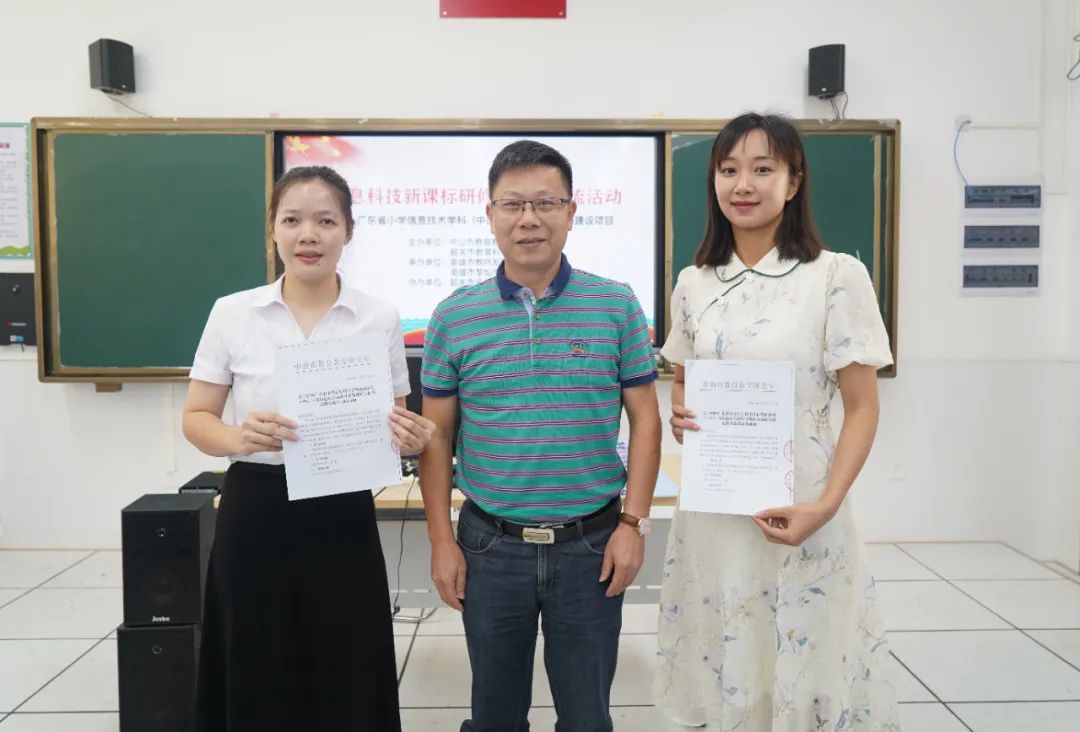 中山市教育教學研究室信息技術教研員陳明宏老師和省級教研基地負責人杏建紅主任分別給兩位老師頒發了送教證明。
