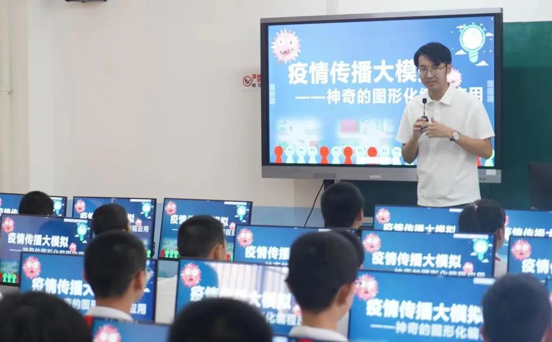 團校翠亨小學呂梓健老師在南雄市永康路中心小學送教課例為《疫情傳播大模擬——神奇地圖形化編程》,讓學生體驗編程對生活現象進行模擬的作用。