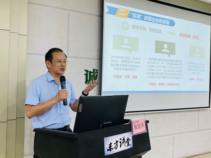 講座伊始,張主任首先讓大家明白“雙減”是什么——指校內減輕學生過重作業負擔和校外減輕培訓負擔。張主任從“雙減”政策出臺的背景出發,通過課件演示、視頻解讀等多種方式,深入淺出地解讀了“雙減”政策,讓教師們充分地認識到“雙減”工作對于全面貫徹黨的教育方針、落實立德樹人根本任務、促進學生德智體美勞全面發展的重大意義。