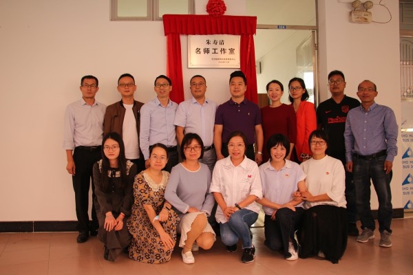 最后,三位教研員和領導一起為“阮班俊名師工作室”、“朱壽清名師工作室”、“黃瑞媛名班主任工作室”揭牌,并與主持人和工作室成員合影留念。