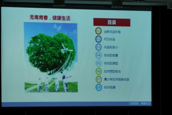 坦州實(shí)驗(yàn)中學(xué)副校長(zhǎng)東武軍,德育處主任朱壽清,副主任柳清泉,坦洲公安分局兩位禁毒民警,北達(dá)博雅五位社工,坦洲微視的工作人員,以及全體初一級(jí)師生參加了此次活動(dòng)。整個(gè)活動(dòng)有四個(gè)環(huán)節(jié):一是播放禁毒宣傳片,二是由東校長(zhǎng)代表學(xué)校講話,第三環(huán)節(jié)由禁毒民警帶領(lǐng)全體師生宣讀禁毒倡議書,最后進(jìn)行禁毒知識(shí)講解。