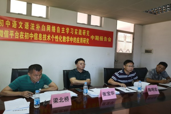 2020年7月10日,中山市《初中語文語法補白網絡自主學習實踐研究》、《微信平臺在初中信息技術個性化教學中的應用研究》課題中期報告會在坦洲實驗中學行政樓會議室舉行。市教研室張寶華老師、陳明宏老師,坦洲鎮教育事務指導中心梁北橋老師,坦洲實驗中學梁格青校長、高艷玲副校長、阮班俊主任出席報告會,課題組全體成員列席本次會議。