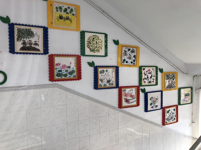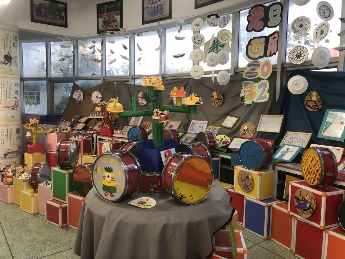 除此之外,安阜小學本次元旦畫展的一大亮點是傳達了環保的理念:學校美術興趣小組的同學們在老師的帶領下把鼓號隊置換下來的舊小鼓變成了畫布,創作了一系列鼓面裝飾畫。為畫展增添了活潑的色彩。