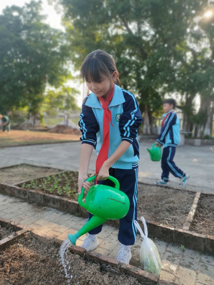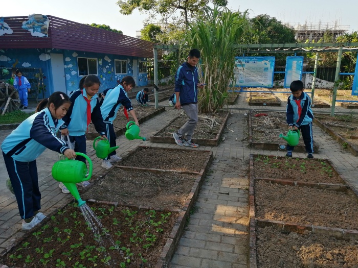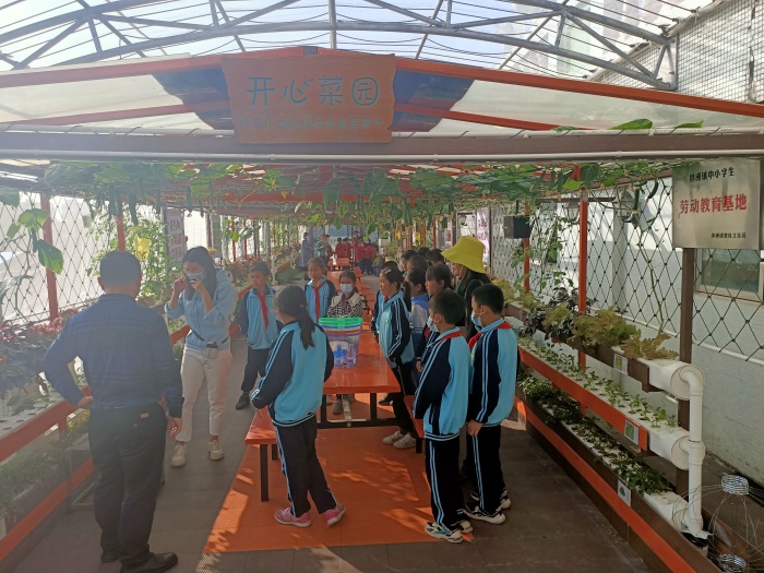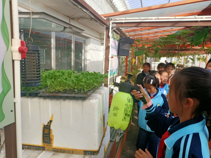 接下來,一行人又隨著講解員來到土培蔬菜區。學生們在老師的指導下分組井然有序地來到田間地頭,研究自己感興趣的蔬菜,并拿起水壺到水渠打水給地里的蔬菜澆水,最后分享各自的收獲。