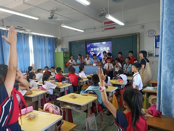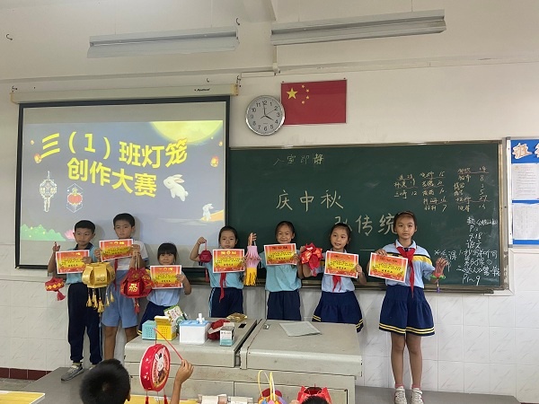 9月18日,為了讓學(xué)生更深入了解中秋節(jié)文化,少先隊大隊輔導(dǎo)員朱文娟老師在國旗下深情地講述關(guān)于中秋節(jié)的來歷,與學(xué)生們一起吟詠文人墨客的經(jīng)典詩文,呼吁大家繼承祖國優(yōu)秀傳統(tǒng)文化和傳統(tǒng)節(jié)日,增強(qiáng)民族文化自信心。班會課上,班主任有條不紊地開展活動。如一、二年級的小朋友,在爸爸媽媽的幫助下帶上月餅、水果等美食,與同學(xué)們開展中秋傳統(tǒng)美食交流會。三、四年級開展一次中秋創(chuàng)意燈籠展示會。會上,學(xué)生提著親手制作的燈籠得意地分享他們的制作樂趣。