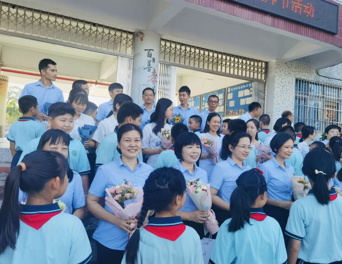 “啊…每當想起你,敬愛的好老師……”活動伊始,由六(1)班表演節目《每當我走過老師窗前》,以此表達同學們對老師無限的敬意與感激之情。隨后,全體教師齊聚操場,由少先隊員代表為老師們獻上節日美好的祝福,送上鮮花以及為老師精心準備的禮物。