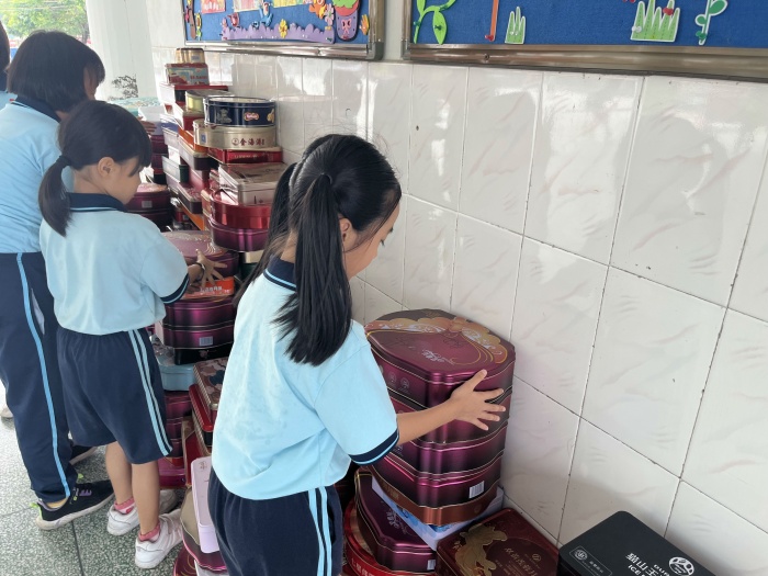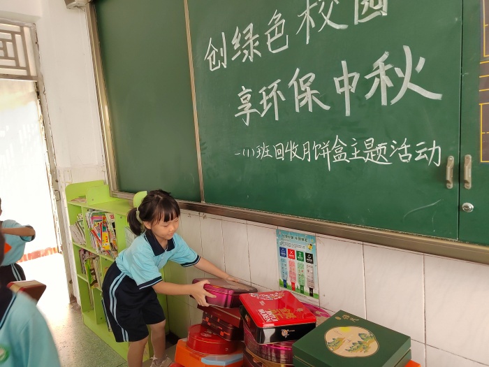 中秋佳節(jié),人們團(tuán)圓歡聚。家人一起賞月、吃月餅讓我們歡喜。在這溫馨無限的時刻,也不要忘記這些各種材質(zhì)的月餅盒還能回收利用。為了讓這些精美的“月光寶盒”能被回收利用,進(jìn)行循環(huán)再造,實(shí)現(xiàn)真正的“變廢為寶”,活動當(dāng)天,學(xué)生們將已經(jīng)取出內(nèi)里裝飾物的月餅盒帶到班級,有序地分為紙質(zhì)盒和鐵皮盒兩類擺放好。各班的班主任登記參加月餅盒回收活動的學(xué)生,并給學(xué)生蓋上紅領(lǐng)巾獎?wù)隆肮?jié)約章”。最后由各班學(xué)生代表將本班同學(xué)的月餅盒帶到資源回收點(diǎn)分類存放。