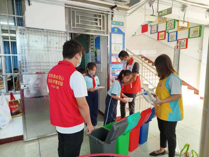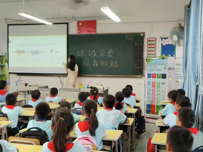 11月17日上午,首先由四(1)中隊輔導員黃舜君老師為隊員們上了一堂以“垃圾分類,從我做起”為主題的宣講課。宣講過程中,黃老師從垃圾分類的認識、做法、好處講起,并介紹了可回收物、廚余垃圾、有害垃圾、其他垃圾四種垃圾分類,講解最新的垃圾分類知識以及注意事項。隨后,坦洲鎮垃圾分類辦的工作人員為隊員們派發了宣傳小冊及環保袋,并讓隊員們參與到垃圾分類箱的活動小游戲中,在實踐中增強環?;厥盏囊庾R。