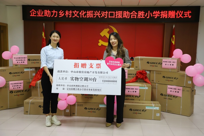 空調捐贈儀式中,中山市駿佳房地產開發有限公司向合勝小學捐贈30臺空調,總價值20萬元。成星姬女士代表中山市駿佳房地產開發有限公司上臺進行捐贈,合勝小學盧云副校長代表受贈方接受捐贈。