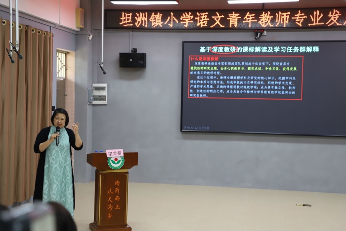 接著由梁雪菊老師開展以《基于深度教研的課標(biāo)解讀及學(xué)習(xí)任務(wù)群解釋》為主題的講座,就“精要研讀新課標(biāo),提綱攜領(lǐng),把握課程要旨。”和“基本學(xué)習(xí)任務(wù)群教學(xué)評(píng)實(shí)案,解構(gòu)教與學(xué)。”兩個(gè)要點(diǎn),為老師們做出專業(yè)指導(dǎo),老師們認(rèn)真聽講,詳細(xì)記錄。她利用身邊的事例,深入淺出地為青年教師指點(diǎn)迷津,同時(shí)也肯定了李老師的專業(yè)素養(yǎng),指出本節(jié)課需要改進(jìn)之處。