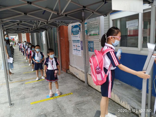 早上7時25分,學生陸陸續續走進校園,值日教師維持秩序,學生相距一米排隊,按照指定路線,依次通過測溫儀,有序進入久別的熟悉校園,學校還特意為學生準備了返校禮物。坦洲鎮教育事務指導中心干事楊建萍來到學校指導復學工作。楊老師詳細詢問了開學第一天學校各方面工作情況,還特別強調返校初期,學生心理調整和心理適應能力的培養非常重要,提高學生心理免疫力。