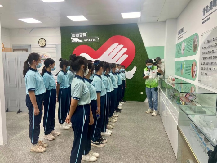 接著,同學(xué)們在禁毒辦梁社工的帶領(lǐng)下,來到模擬KTV、監(jiān)獄實(shí)地等感受吸毒帶來的巨大危害。隨后,全體同學(xué)進(jìn)行禁毒宣誓,堅(jiān)決牢記歷史使命,弘揚(yáng)硝煙精神,自覺抵制毒品誘惑。最后,全體學(xué)生觀看禁毒視頻,直觀、詳實(shí)的內(nèi)容介紹,讓孩子們更加直觀地了解毒品以及吸食毒品帶來的危害性。
