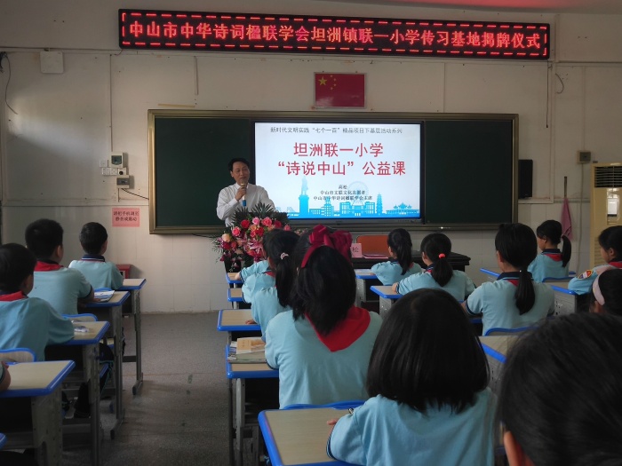 中山市中華詩詞楹聯學會主席高松先生、坦洲鎮(zhèn)文學協會會長方偉華先生、坦洲鎮(zhèn)文學協會副會長唐云光先生、鄭豪情先生、王宏先生和聯一小學全體行政及語文教師參加此次活動。