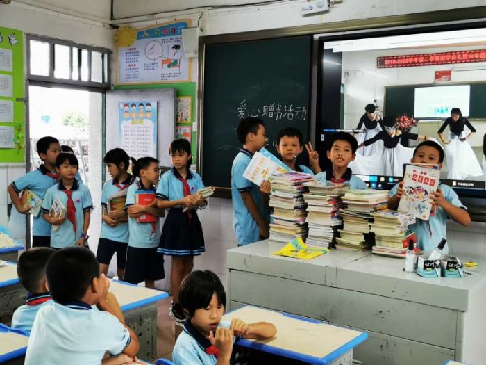 圖書捐贈現場,同學們熱情高漲,小手緊緊拿著將要捐贈的書本,踮起小腳,把手舉得高高的,等待著捐書儀式的開始……班主任有序地參與書籍審核、登記、分類、整理等一系列捐書流程;再由班級代表將班級捐贈的全部書籍統一收集在多媒體教室中。贈人玫瑰,手有余香,同學們的臉上洋溢著幸福的笑容。