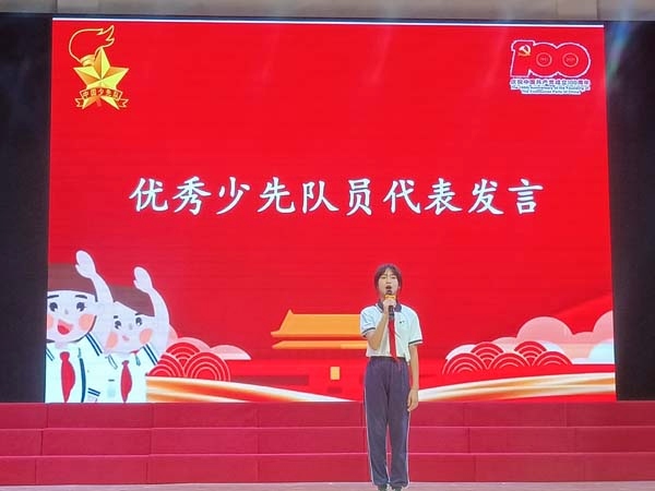 隨后,常老師帶領新隊員們在隊旗下莊嚴宣誓。新隊員代表倪宸和老隊員代表賀晨晞兩位隊員分別進行了發言。他們都表達了對少先隊組織的擁護,在黨的教導和少先隊組織的呵護下好好學習,請黨放心,強國有我。常老師也對新隊員們表示祝賀并提出了殷切的希望,希望新隊員們在星星火炬旗幟的指引下,緊緊銘記先輩的教導,以嚴格的標準規范自己的行為,做搏擊風雨之雄鷹。最后,全體隊員在大隊長邵越同學的帶領下齊聲呼號。
