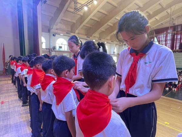 學校大隊輔導員常偉麗老師宣讀了二年級分批入隊的新隊員名單,并由五(3)中隊的優秀少先隊員代表為新隊員戴上了鮮艷的紅領巾。戴上紅領巾的新隊員們個個精神抖擻,臉上洋溢著幸福和自豪的笑容。
