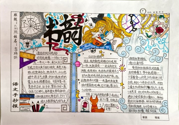 學(xué)生們的作品色彩艷麗,構(gòu)思獨(dú)特,內(nèi)容豐富,有美文欣賞、名人讀書故事、好書推薦、讀書名言等專欄。學(xué)生通過自己精心地設(shè)計(jì)、繪制,盡情體驗(yàn)著閱讀帶來的快樂,充分展現(xiàn)著閱讀帶來的智慧和才氣。在創(chuàng)意貼畫作品中,貼畫構(gòu)圖飽滿,主題鮮明,內(nèi)容突出,畫面色彩搭配合理。